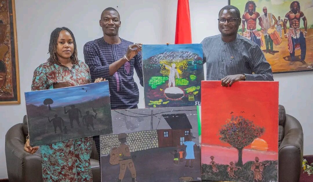 Au cours de l’audience, l’adjudant Abdoul Rasmané Wendyam OUEDRAOGO, coordinateur principal des ateliers, a présenté au ministre plusieurs œuvres produites par des éléments des Forces de Défense et de Sécurité (FDS) et des Volontaires pour la Défense de la Patrie (VDP) blessés sur le champ de bataille. Pendant plusieurs jours, ces soldats et volontaires ont participé à des sessions d’expression artistique destinées à leur offrir un espace de reconstruction personnelle.