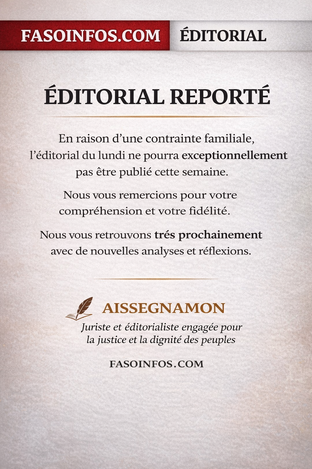 En raison d’une contrainte familiale, l’éditorial du lundi ne pourra exceptionnellement pas être publié cette semaine. Nous vous remercions pour votre compréhension et votre fidélité. Nous vous retrouvons très prochainement avec de nouvelles analyses et réflexions. ✍🏾 AISSEGNAIMON Juriste et éditorialiste engagée pour la justice et la dignité des peuples FASOINFOS.COM