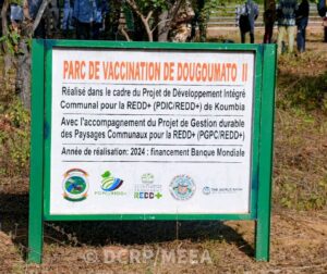 Le marathon du ministre l’a d’abord conduit à Dougoumato 1 dans la commune rurale de Koumbia dans le Guiriko où la population bénéficie d’un parc de vaccination. La réalisation du parc de vaccination permet de préserver les ressources forestières. Le Modèle de parc de vaccination réalisé par le PGPC/REDD+ permet d’épargner en moyenne 400 pieds d’arbres par an. En effet, les parcs de vaccination traditionnels sont généralement construits avec une grande quantité de bois et demandent un renouvellement permanent en bois. La réalisation de cet ouvrage en matériaux définitifs réduit donc cette coupe de bois permanente. En plus de la préservation de la ressource forestière. c’est un cadre sécurisé pour la vaccination des animaux qui vient améliorer la santé animale et les revenus de 100 hommes dont 20 jeunes, 10 PDI et 5 Transhumants.